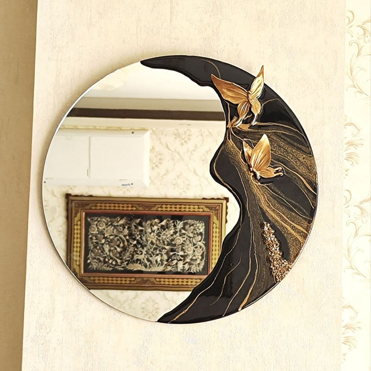 طراحی لوکس و چشم‌نواز: استفاده از ترکیب آینه، رزین و پروانه‌های طلایی یا نقره‌ای، باعث می‌شود این تابلوها حس لاکچری و مدرنیته را به محیط اضافه کنند.