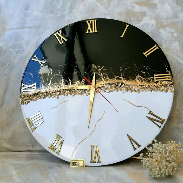 ✔️ جنس متریال: رزین اپوکسی باکیفیت، عقربههای فلزی طلایی، اعداد برجسته رومی