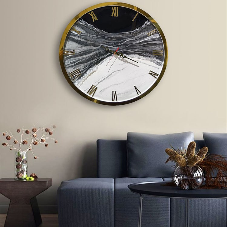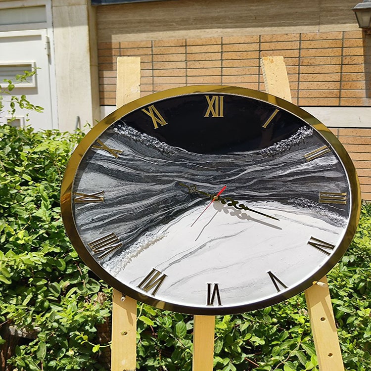 ساعتی که در تصویر مشاهده میکنید، یک ساعت دیواری گرد با طراحی هنری و منحصربهفرد است که با تکنیک میکس مدیا و رزین ساخته شده است. این ساعت ترکیبی از رنگهای مشکی و سفید مرمری همراه با جزئیات درخشان نقرهای و قاب طلایی دارد که جلوهای لوکس و مدرن به دکوراسیون منزل یا محل کار شما میبخشد.